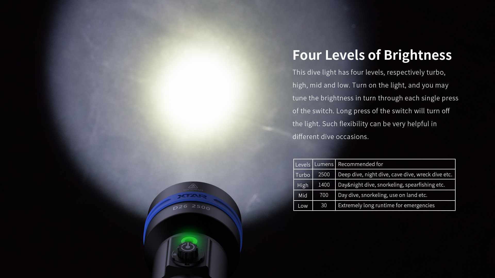 XTAR D26 2500 подводен фенер предлага мощна максимална яркост от 2500 лумена и време на работа от 2 часа. Предлага се в дълга и къса версия, като и двете имат 4 нива на осветление. Ако търсите подводен фенер, който да отговаря на повечето ви нужди, XTAR D26 2500 е един от най-добрите избори. Може да бъде основен фенер за развлекателно гмуркане, както и безопасен или резервен фенер за техническо гмуркане.