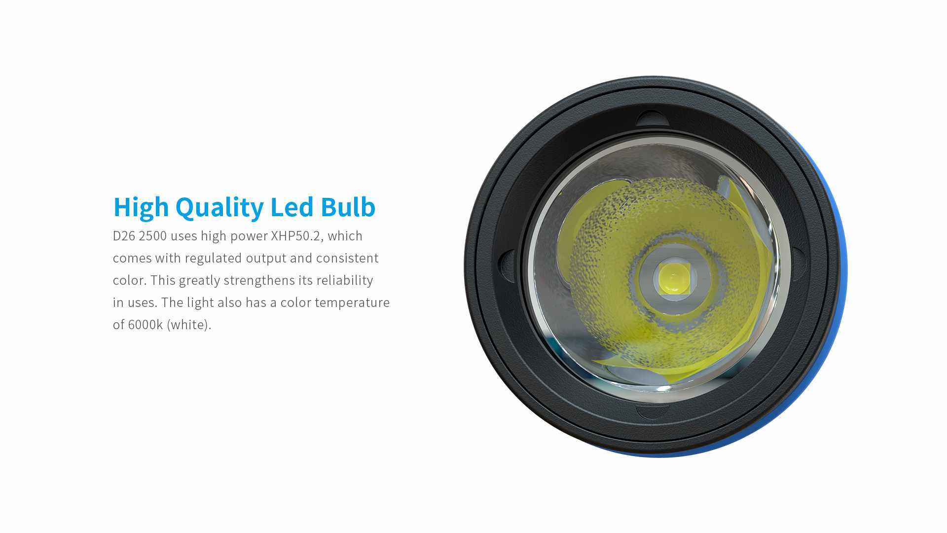XTAR D26 2500 подводен фенер предлага мощна максимална яркост от 2500 лумена и време на работа от 2 часа. Предлага се в дълга и къса версия, като и двете имат 4 нива на осветление. Ако търсите подводен фенер, който да отговаря на повечето ви нужди, XTAR D26 2500 е един от най-добрите избори. Може да бъде основен фенер за развлекателно гмуркане, както и безопасен или резервен фенер за техническо гмуркане.